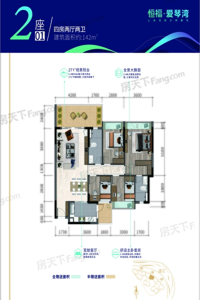 清远恒福·爱琴湾4室2厅2卫1厨142.00㎡户型图-凯时娱乐