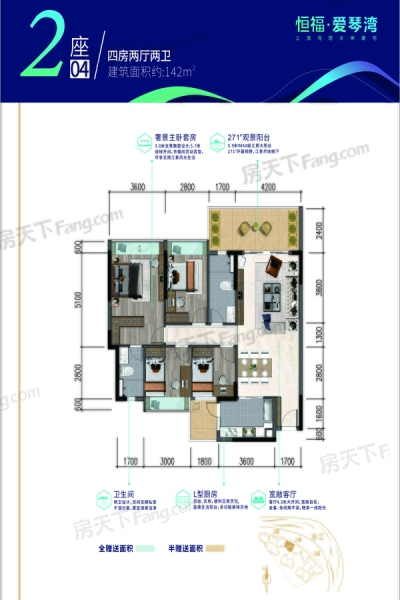 清远恒福·爱琴湾4室2厅2卫1厨142.00㎡户型图-凯时娱乐