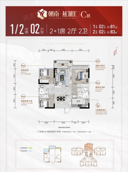 清远朝南燕湖汇3室2厅2卫1厨81.00㎡户型图-凯时娱乐