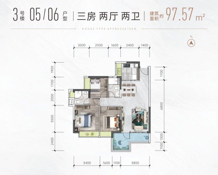 清远蔚蓝·天境3室2厅2卫1厨97.57㎡户型图-凯时娱乐