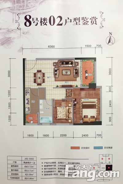 清远佛冈华府2室2厅1卫1厨63.72㎡户型图-凯时娱乐